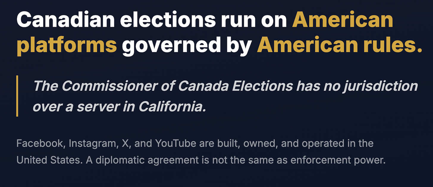The platforms where most Canadians get their news and political information, Facebook, Instagram, X, YouTube, are built, owned, and operated in the United States. They do not answer to Canadian electoral law the way a Canadian company would. The Commissioner of Canada Elections has no jurisdiction over a server in California.